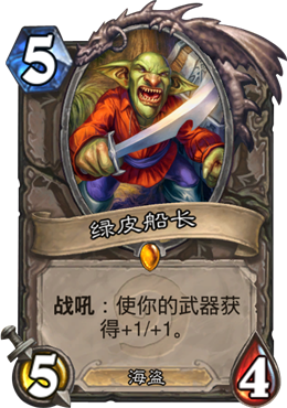 这张牌是一张浮夸的强力橙卡,但是出场率仍然较低。它有5/4的身材,足以换掉淤泥喷射者或者索瑞森大帝。但战吼效果就使得要削弱这张牌的呼声很高,因为它实在是太强了。当有一个可靠的身材和荒谬的效果时,这张牌就已经具有了致胜卡牌的潜力。加武器攻击力和耐久的效果实在太凶了,基本能多造成相当于火元素或者地精炎术士效果打的伤害。但这张牌的伤害可以蓄而不发,并且最多可能多造成8点伤害如果你用了特定武器的话。有刀职业很喜欢这张牌,并且和罕见的海盗套能很好地配合。