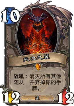 死翼是《魔兽世界》设定中最标志性,最强的反派之一,所以他的出场率低实在是令人感到可耻,考虑到他那毁天灭地之能。它基本上就是一个大清场以及背水一战来赢得比赛,而这会令大多数玩家觉得是一种很不爽的代价。没人想冒这个险把胜负赌在一张卡上,因为只需要一张王牌猎人它就拜拜了。但死翼并不是中期应该上的。死翼应该一直捏在手上直到很后期很后期才上,当你使用的是一套硬控卡组来尽量拖延比赛节奏的时候。它并不是用来中期清场,而应该是终结你对手的最后一击。