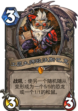 这张牌刚出的时候简直被捧上了天。玩家们在它还没出的时候就已经开始呼吁削弱它了。但从那以后大家忽然对它失去了兴趣,由原来的宠儿一落千丈,最后干脆弃之不用了。砰砰博士取代它成为了7费曲线上的终极卡牌,而且再也无法挽回了。是时候重新看看这张牌了,因为它的效果可能是整个游戏里面最强的效果之一。如果这张卡用对了地方的话,围绕它的战术简直可以将目前的格局打乱重新洗牌。现在它的使用方法还有待开发。它一直等待着某个人将它的用法开发出来。