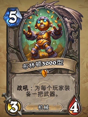 这张牌效果太丰富了。3/4的身材对5费随从来说真心不够看,但依然算大个随从了,并且这也不是它唯一附加的东西。换句话说,这张牌就是个随从,而不仅仅是个效果。但它是因为这效果才配得上橙卡的。基本上是你来“支配”这个战吼效果,虽然它是个对等效果(敌我都受益)。你的武器可以先挥,保证你对对手仍然有节奏压制。你甚至有机会搞到一把强力武器,从而将雪球越滚越大,获得对手无法企及的巨大优势。这张牌对付有刀职业(译者按:战士,潜行者,猎人,圣骑士)因为你可以炸掉他们蓄意装好的武器,然后随便给他们换一把不知道什么的武器。当然最后你的对手有可能会获得一把更好的武器,但你还有第一时间处理掉这情况的机会。