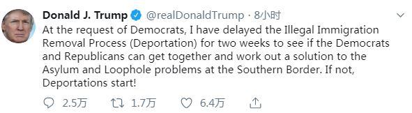 “应民主党人的请求,我已经将遣返非法移民推迟了两周,看民主党人和共和党人是否能够一起合作,拿出一个方案解决庇护和南部边境的漏洞问题,”特朗普在推特中说,“如果不能,就将开始遣返!”