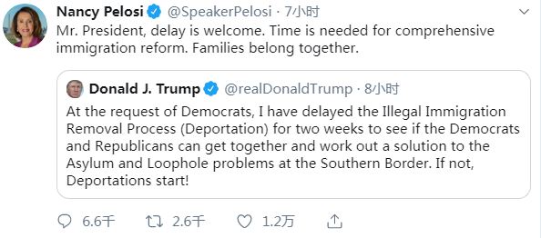 佩洛西在推特回应了特朗普这一宣布,“总统先生,我们欢迎推迟行动。全面的移民改革需要时间。家人们应该在一起。”