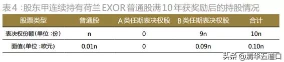 如果股东甲连续10年持有荷兰EXOR普通股n份,则新集团对其奖励后,股东甲的持股情况见表4。股东连续持有荷兰EXOR普通股满10年的,每位股东持有的每1普通股代表10份表决权。