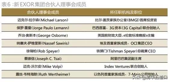 三是2018年5月新集团正式成立了合伙人理事会(Partners Council),由英国前财政大臣乔治·奥斯本(George Osborne)担任主席,成员包括比尔·盖茨家族办公室首席投资官迈克尔·拉尔森、巴西首富保罗·雷曼、以色列首富韦特海默家族成员Ruth Wertheimer、全球最大不动产公司之一铁狮门第五代家族成员Rob Speyer、阿里巴巴副主席蔡崇信等8名全球商界领袖(表6)。理事会成员大多在过去十年间与EXOR集团有过密切合作,能为新业务拓展带来更多的机会和建议,同时高管层也会列席理事会会议。