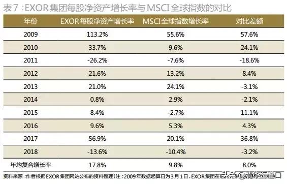 2018年4月,新集团发布了2017年年报,这是整合后的第一份完整年报,埃尔坎交出了EXOR集团自2009年成立以来最漂亮的一份成绩单。2018年末集团净资产达到229.7亿美元,每股净资产价值(NAV per share)增长了56.9%,与2017年MSCI全球指数增长率相比高出了36.8%,年均复合增长率高达22.1%(表7)。在“2017年致股东的信”中,埃尔坎解释了由于新EXOR集团目前主要是一家多元化投资控股公司,所以采用了每股净资产价值这一指标来衡量公司价值和成长性。