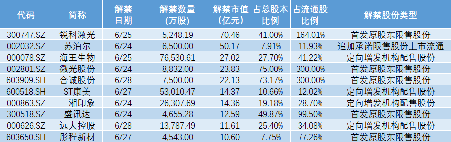解禁市值超过10亿元的公司合计有11家,前三分别为锐科激光(70.46亿元)、苏泊尔(50.17亿元)、海王生物(27.02亿元)。