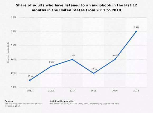 (从2011年到2018年,美国成年人过去12个月内收听过有声书的人比例攀升。图自皮尤研究中心)