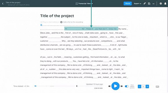 从使用界面上来说,Spext 和传统的音频编辑软件长得就很不一样。与传统音频软件的波浪线不同,Spext 的产品 “声音编辑器”(“Editor”)不仅把音频直接转译成文字, 而且还能让用户通过编辑文字,直接编辑音频。用 Anup 的话说,Spext 的产品 “看起来像是用于音频编辑的 Google 文档”。