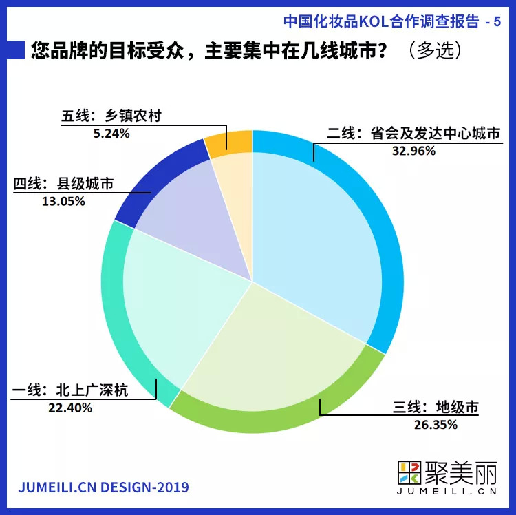 根据参与调查的行业人士,其品牌受众主要集中在二三线城市,比例高达59.31%,另外一线城市(北上广深杭)占据了22.4%,四线城市和五线城市的消费者分别占据了13.05%和5.24%。