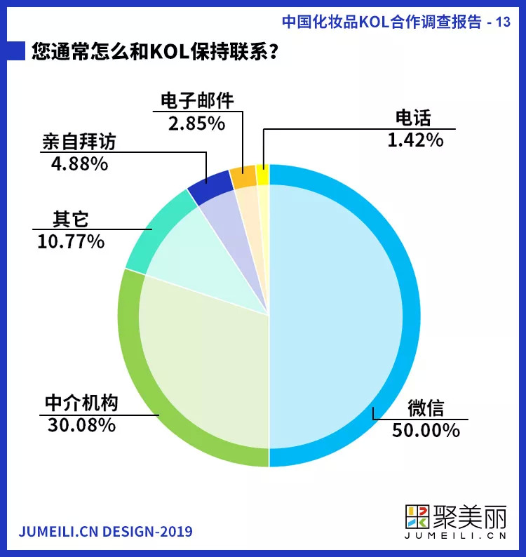 而在与KOL联系中,因为微信成为中国网民最重要、最常见的沟通方式,所以和其他国家采取电子邮件或者Instagram的联系方式有明显不同——中国化妆品企业多采取用微信的方式沟通,比例达到50%。