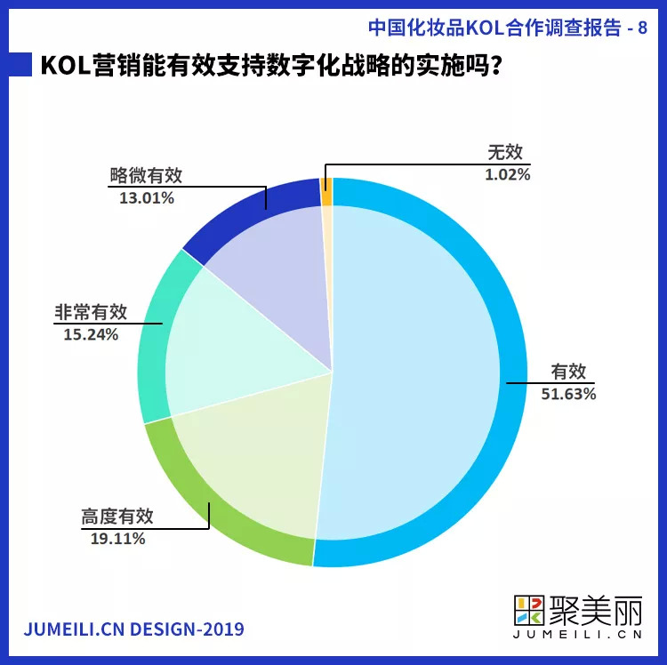 ◆98.98%的人认为KOL能有效支持数字化战略的实施,其中认为非常有效和高度有效分别占据15.24%、19.11%;