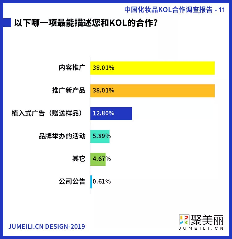 在调查中,采取内容推广和新产品推广的形式与KOL合作同时占据了最大的比例,都达到38.01%,其次是通过植入式广告和品牌举办活动与KOL合作。