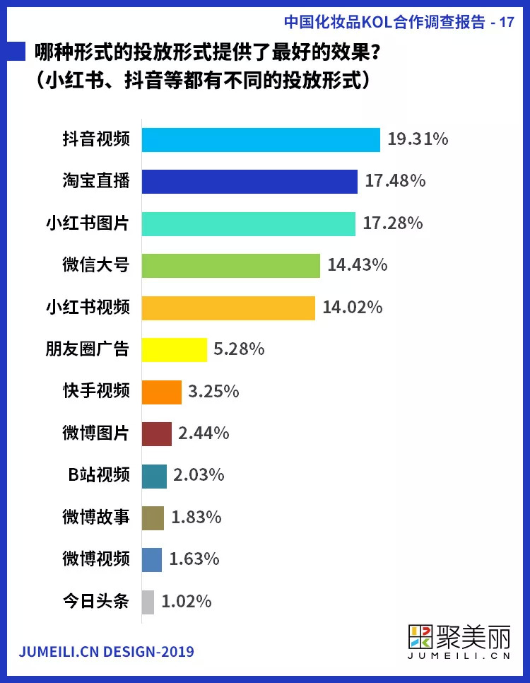 鉴于与KOL共创内容的形式多样,我们也询问了受访者认为效果最好的投放形式。明显,小红书成最大赢家,因为有14.02%的受访者认为小红书视频的效果最好,17.28%的受访者表示小红书图片能取得最好的效果。