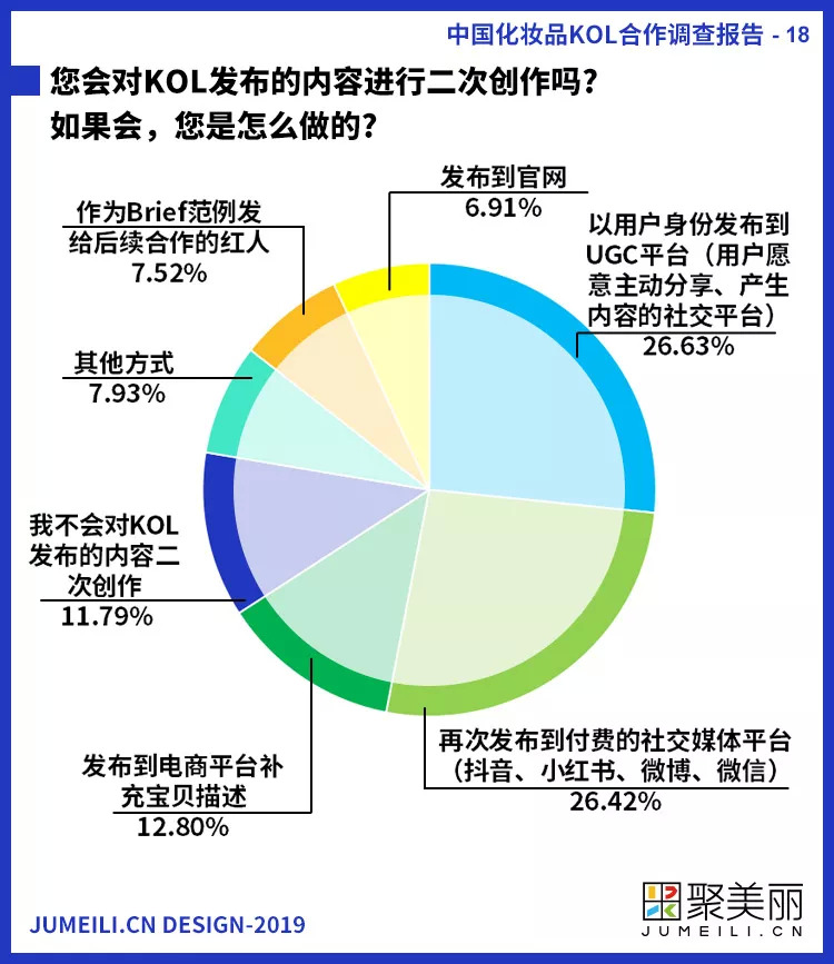 一些品牌已经掌握了如何充分利用KOL创造的内容。26.63%的受访者表示会以用户身份将KOL发布的内容发布到UGC平台上,26.42%的受访者则表示会将KOL发布的内容再次发布到付费平台上。
