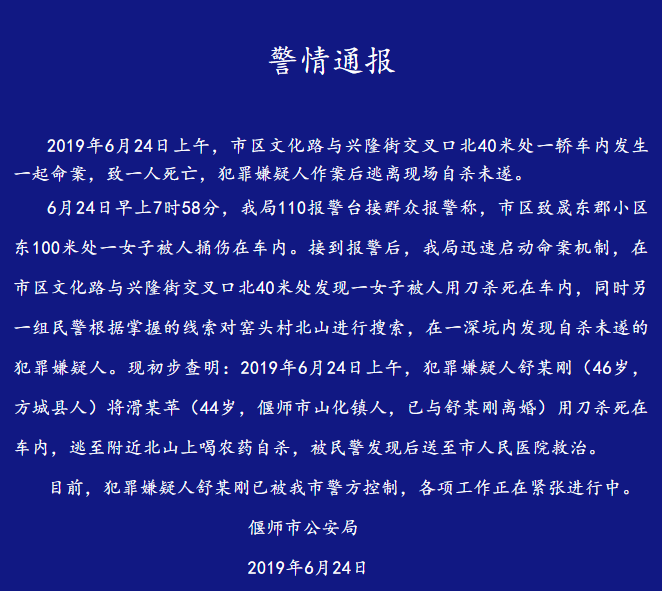 6月24日早上7时58分,我局110报警台接群众报警称,市区致晟东郡小区东100米处一女子被人捅伤在车内。接到报警后,我局迅速启动命案机制,在市区文化路与兴隆街交叉口北40米处发现一女子被人用刀杀死在车内,同时另一组民警根据掌握的线索对窑头村北山进行搜索,在一深坑内发现自杀未遂的犯罪嫌疑人。现初步查明:2019年6月24日上午,犯罪嫌疑人舒某刚(46岁,方城县人)将滑某苹(44岁,偃师市山化镇人,已与舒某刚离婚)用刀杀死在车内,逃至附近北山上喝农药自杀,被民警发现后送至市人民医院救治。
