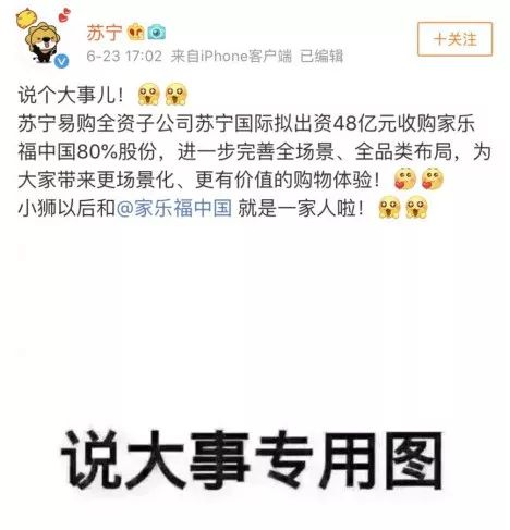 6月23日17点,苏宁易购突然发布告称,公司全资子公司苏宁国际拟出资48亿元人民币等值欧元收购家乐福中国80%股份。本次交易完成后,苏宁易购将成为家乐福中国控股股东,家乐福集团持股比例降至20%。