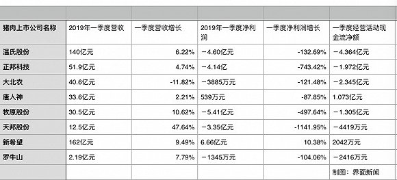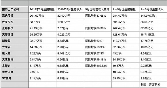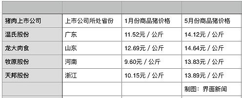 根据界面新闻记者统计,从今年3月份开始,全国各猪肉上市公司生猪价格开始大幅上涨,并带来收入的快速增长。温氏股份2019年1月份,商品猪价格为11.52元/公斤,5月份商品猪价格则上涨至14.12元/公斤,天邦股份一月份商品猪价格10.15元/公斤,5月份商品猪价格上涨至13.89元/公斤。