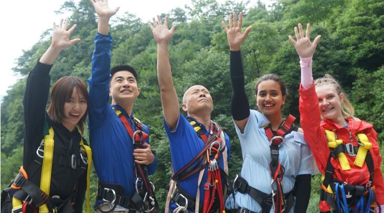 如此惊险的一幕,出现在6月23日的重庆万盛奥陶纪景区,这是全球首次五人跳极限荡绳,由多国选手共同参与完成,但多数是女生。