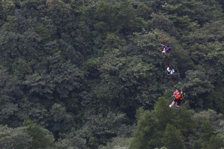 五个人,“串烧”在一条没有弹性的绳子上,一起从上百米高的悬崖跳下去!