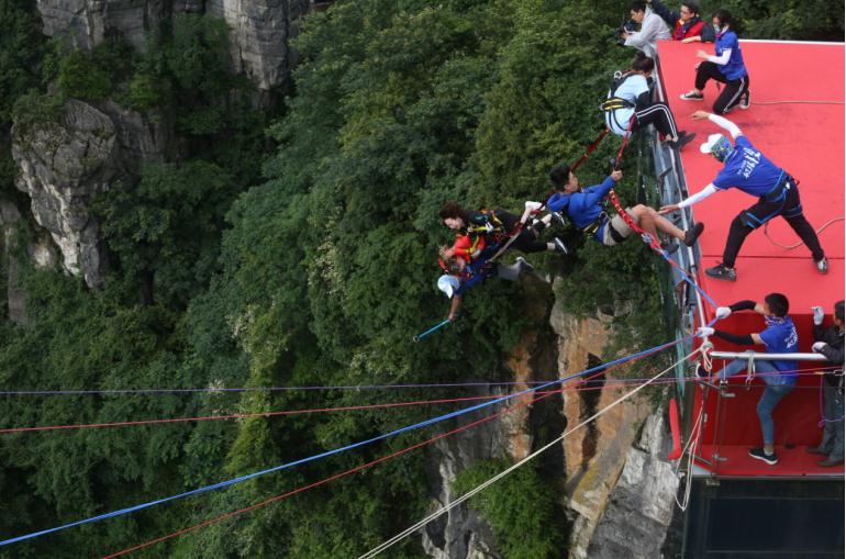 为了让选手能适应极限荡绳,段树军让选手们先各自跳了一次单人跳——逐个跳下悬崖,在空中划出一道弧线,变为天空中的一个小点,围观游客一阵尖叫,这已经够惊险刺激了。