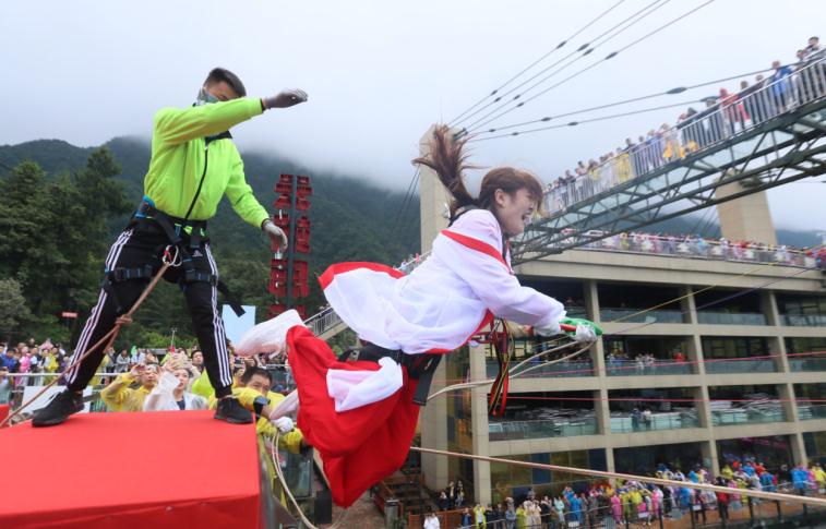 奥陶纪的极限荡绳挑战赛每年一届,今年分为单人、双人、国际、创业等组别,今天(6月24日)是今年极限荡绳挑战的最后一天,这也是这个悬崖项目最集中的国内景区,在注意力经济时代别出心裁想出的一个“节”,让喜欢刺激的年轻人为之疯狂打call,刷爆了各大短视频平台和朋友圈。