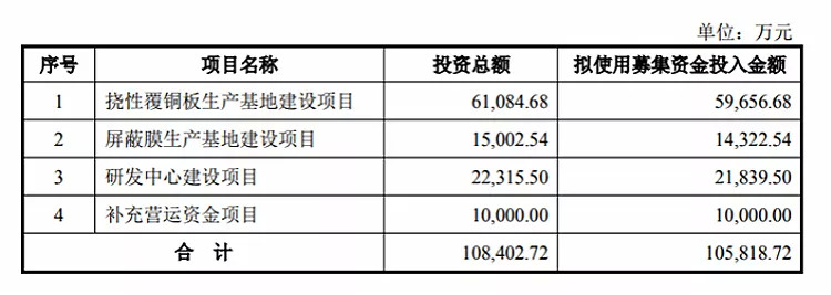或许是上述多种原因所致,方邦电子新开拓FPC另一上游业务——挠性覆铜板,相关募投项目金额居其IPO募投项目之首。