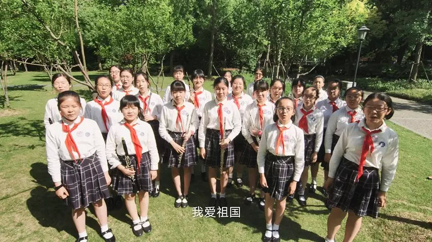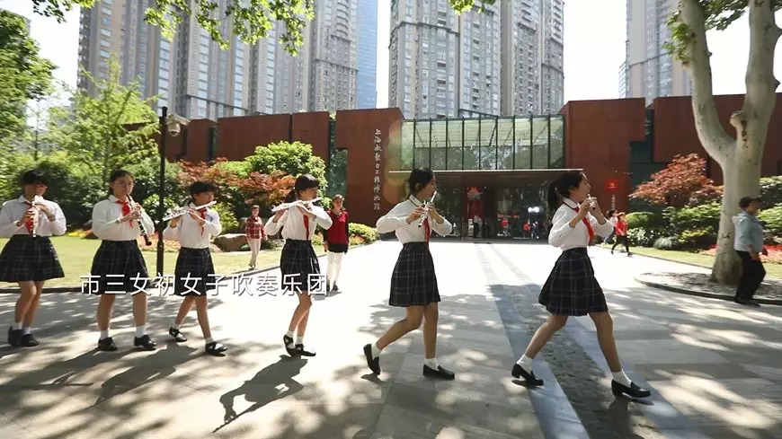 “我和我的祖国,一刻也不能分割……”熟悉的旋律从轻快的长笛、浑厚的单簧管中跃出,市第三女子中学吹奏乐团的学生们各执乐器出现在园内上海凝聚力工程博物馆前。人们越聚越多,手里挥舞着国旗,使这里逐渐成为红色的海洋。