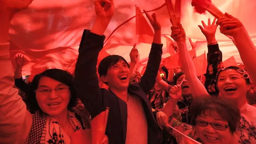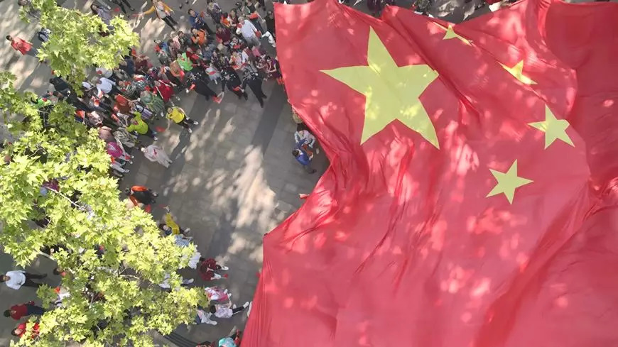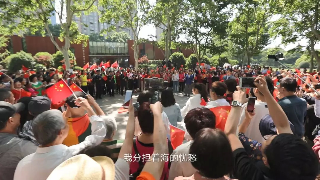 一面巨幅五星红旗在人群上方展开,人们开始欢呼。