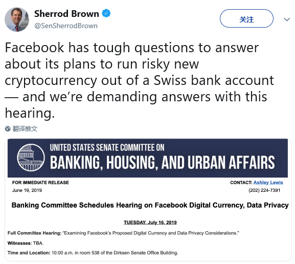 6月19日,布朗在推特上公布了参院将于7月16日对Libra项目进行听证会的消息。听证会的全称为“检验Facebook提出的数字货币计划及数据隐私顾虑”。