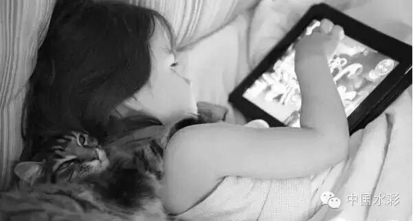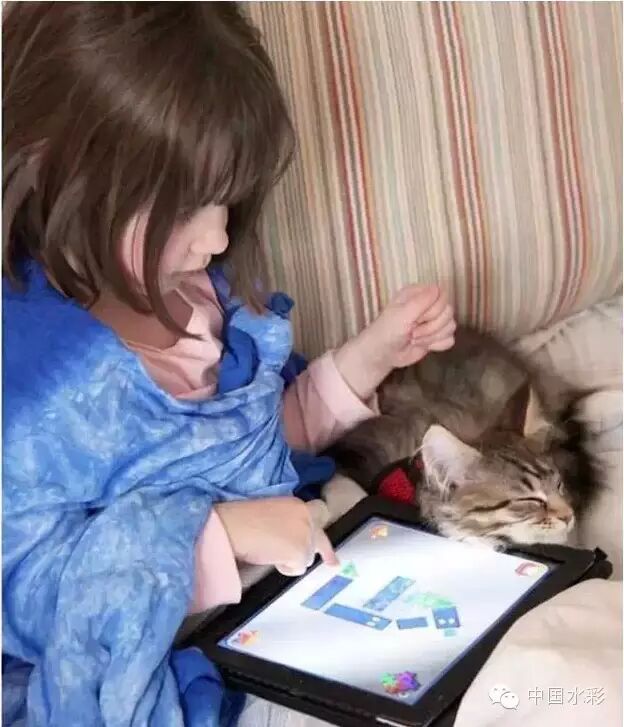 她虽然一只手在iPad上玩游戏,一只手却落在小猫身上。