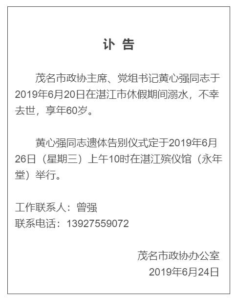 茂名市政协2019年6月24日在官网发布讣告称,茂名市政协主席、党组书记黄心强同志于2019年6月20日在湛江市休假期间溺水,不幸去世,享年60岁。
