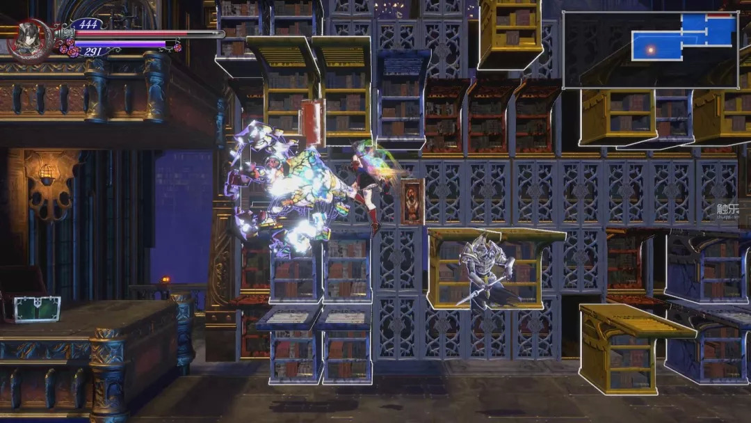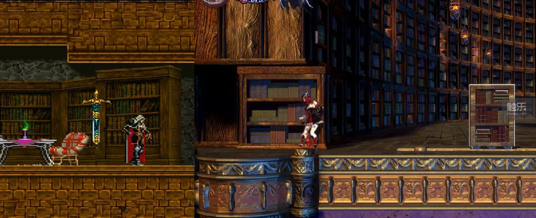 此外,《夜之仪式》里有且仅有一处隐藏房间不是靠打坏墙壁进入,而是靠玩家推动一个明显后边有空间的书架发现的,这正是《月下夜想曲》中曾经惊艳玩家的设计之一,也是“恶魔城”系列里极少出现的非破坏性发现隐藏房间的方式。故意重现在这里,就像多年不见的老朋友拿着照片和你叙旧:“那些有趣的日子,还记得吗?”