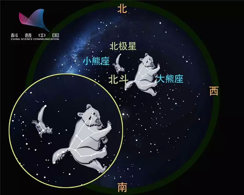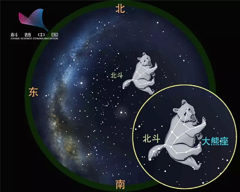 北斗七星属于大熊座,勺头是大熊的腰部,勺柄是大熊的尾巴(图2)。