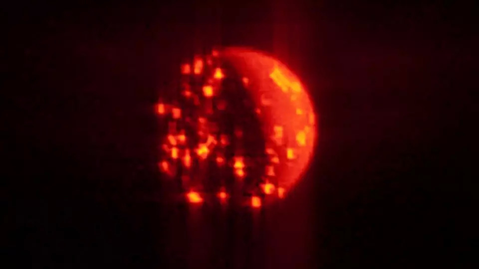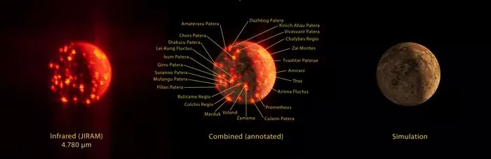 本文开头的那张照片利用肉眼不可见的红外光,展示了木卫一所有的火山光芒,由朱诺号探测器的木星极光红外成像仪拍摄。每个亮斑都是该卫星表面上一座火山发出的光。