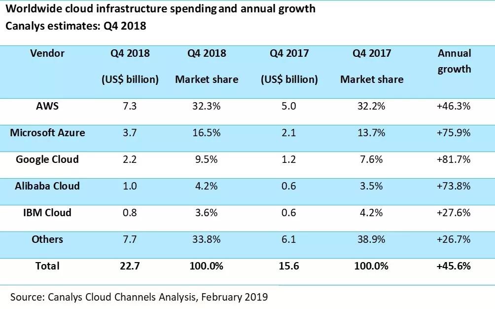 报告显示,2018年全球云计算市场规模达到804亿美元,同比大幅增长46.5%。虽然2018年Azure增幅高达82.4%,但市场份额与第一名的AWS相差15%左右。