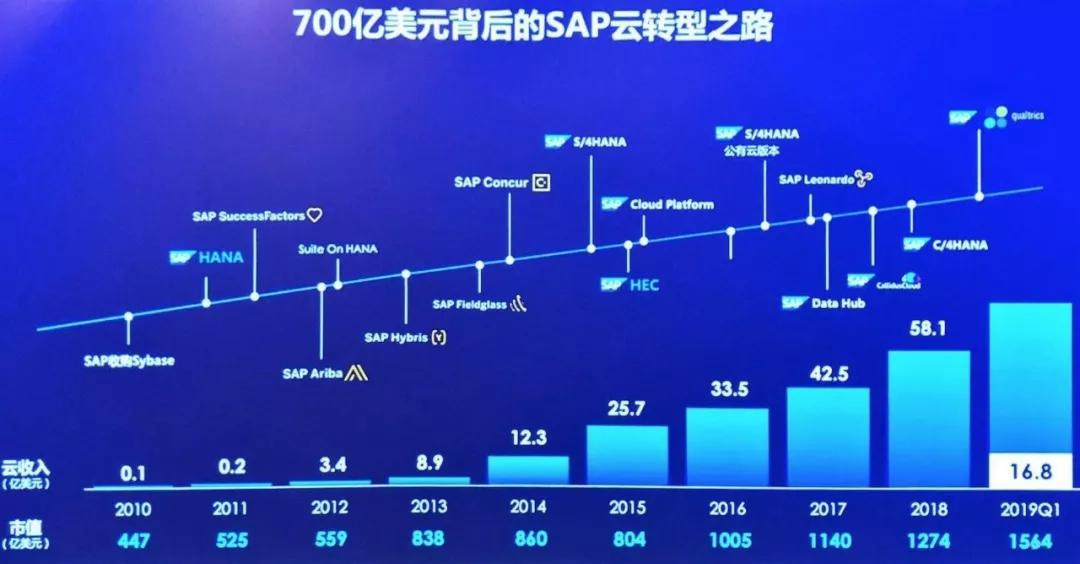 为了完成转型,SAP付出了巨大努力和成本。过去十年间,SAP在技术上投资高达700亿美元,先后收购了Hybris、Success Factors、Ariba、Concur、Fieldglass、Qualtrics等垂直领域解决方案商。