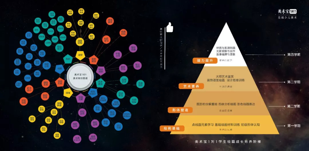 以美国国家艺术培养体系K-12艺术教育体系和中国美术少儿考级体系为基础,美术宝1对1教研团队推出覆盖多个年龄段、认知水平、绘画能力的阶段性课程。每套课程除了涉及绘画知识,还有围绕主题展开了自然、历史、人文,甚至是审美能力、情绪表达等方面的内容。“不同于其它学科,美术教育实际上是非标产品,课程的设计可以有很多的延伸,可开发的内容也有很多。”