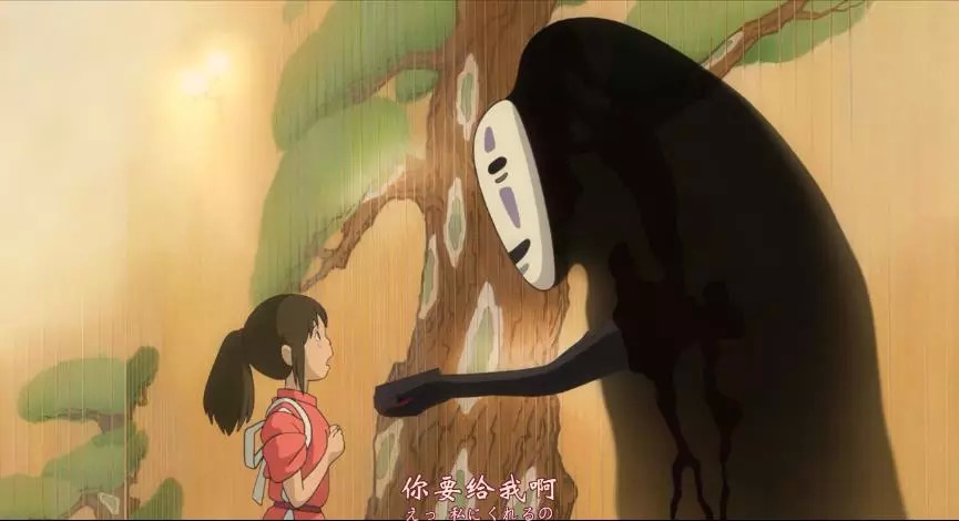 孤独的符号无脸男,在这个忙着赚钱的世界里只是个透明的存在,只有千寻会问他:你站在雨里不怕被淋湿吗?
