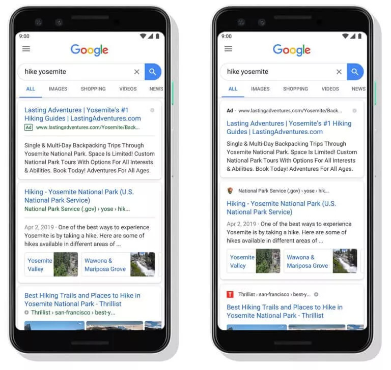 更值得注意的是这次改版凸显了付费广告的不同标记。现在在搜索结果当中嵌入的广告,将会引入一个加粗黑字“广告”(“Ad”)标签,这替换了 2017 年在移动版引入的浅绿色边框标签,更为醒目。