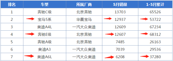 自打全新一代的A6L到来后,2019年前五个月的销量3.72万辆,月均不过7400余辆。而E级和5系在1-5月的销量却分别达到了6.83万辆和5.37万辆。