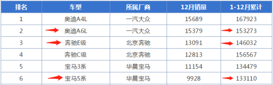 老款A6L在去年一共卖出了15.32万辆,而同期的奔驰E级与宝马5系的销量分别是14.60万辆和13.31万辆。