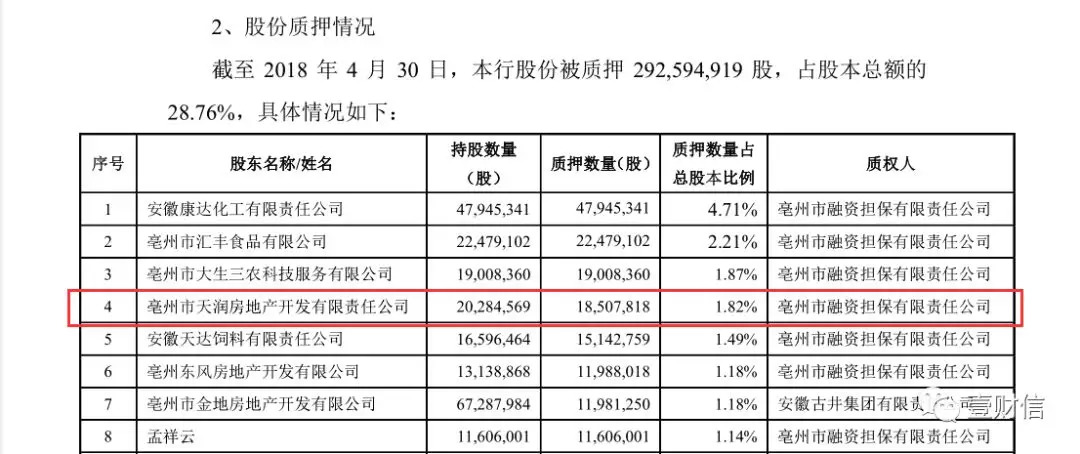另据招股书,截至 2018 年 4 月 30 日,亳州天润共持股20,284,569股,已将18,507,818股(占其持股总数的91.24%)质押给亳州市融资担保有限责任公司,质押数量占药都农商行总股本比例为1.82%,而质权人亳州市融资担保有限责任公司还是药都农商行的第三大股东建安集团间接控股,关联关系错综复杂。