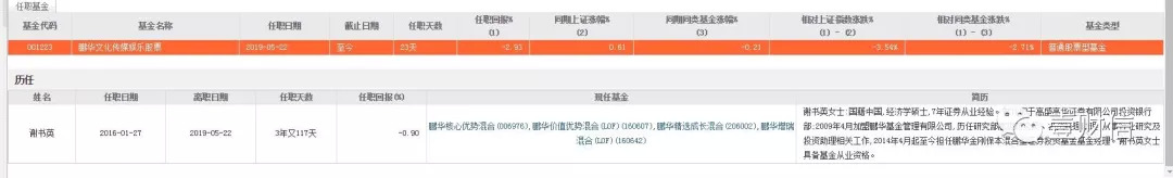 至于前任谢书英离职的原因,上图一目了然,其任职回报仅为0.9%。从她的简历可以看出,曾经任职于高盛高华证券,2009年加盟鹏华基金,从研究员做起,后担任投资经理助理。2014年4月起担任鹏华金刚保本混合型证券投资基金经理,2年后,接手鹏华文化传媒娱乐股票型基金。