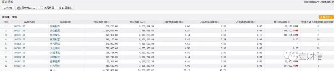 据最新定期报告显示,该基金前十大重仓股为完美世界(持仓比例8.35% )、分众传媒(持仓比例7.14% )、星辉娱乐(持仓比例5.60% )、东方财富(持仓比例5.59% )、当代明诚(持仓比例4.01% )、天虹股份(持仓比例3.96% )、宋城演艺(持仓比例3.91% )、洲明科技(持仓比例3.86% )、芒果超媒(持仓比例3.83% )、东方明珠(持仓比例3.48% ),合计占资金总资产的比例为49.73%,整体持股集中度为中等。