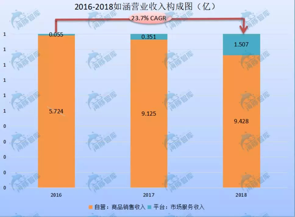 而2018年如涵自营业务达到9.428亿,同比增加仅3%。另外,如涵2018财年第四季度平台收入较同期增长三倍以上,可见如涵正在通过广告等服务加重平台运营的投入。