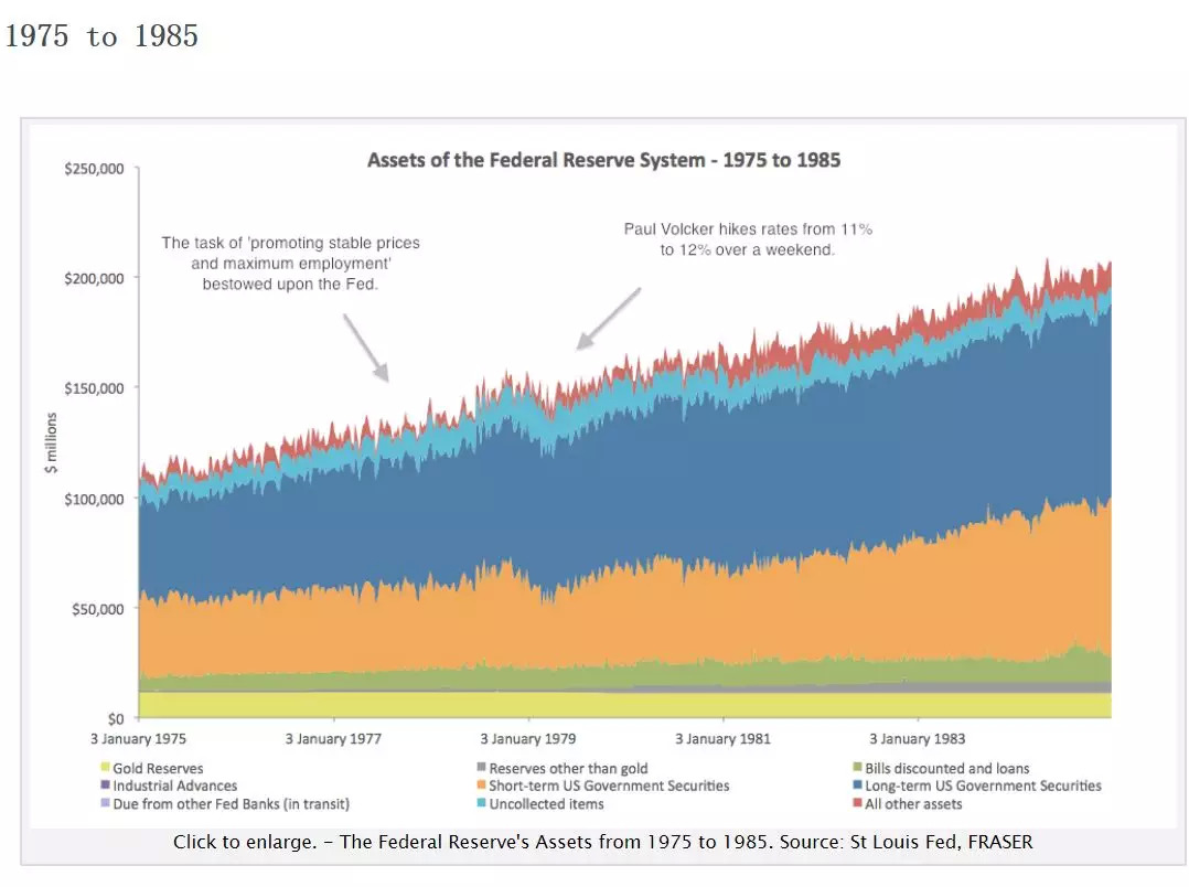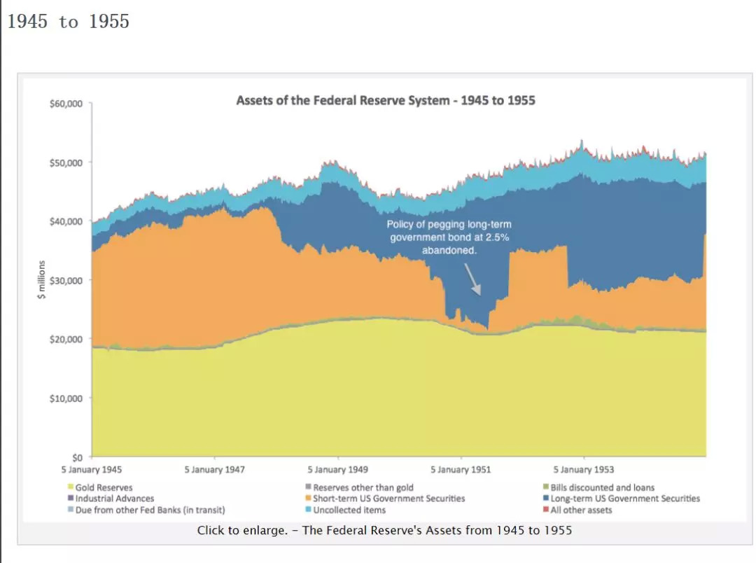 如下图所示,从1915年到1955年,黄金储备在美联储资产端中一直占据着起码半壁江山(最下方淡黄色部分):