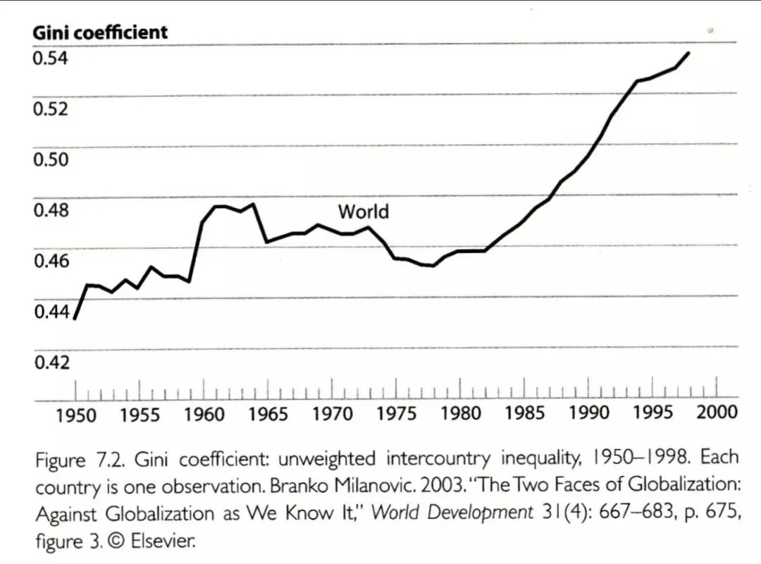 其实,在机构现金池之崛起的背后,还嵌套着“比宏观更宏观”的宏大图景。比如,以日本为代表的东亚模式(即,政府主导型经济体制下的外向型发展模式)在亚洲新兴经济体中的传播,显然与新兴经济体外储规模的扩大息息相关(此外,1997年亚洲金融危机之后心有余悸的亚洲尤其东南亚经济体开始囤积外储也是原因之一);交通与信息技术革命,使全球财富总量急剧提高,亦使跨国企业的进一步发展成为可能;而80年代以来里根-撒切尔掀起的新自由主义浪潮,一方面吹来了金融去监管的东风,各种形式的金融创新开始不断兴起,资管公司的发展亦有了更肥沃的土壤,但另一方面也使得贫富差距不断扩大(如下图所示,50年来,尤其是80年代后,世界基尼系数急剧上涨),全球财富越来越集中于少数人手中……这些也都是文初所述20世纪以来人类世界深刻的社会经济变革之体现。