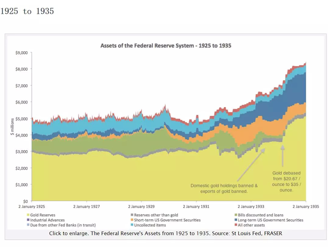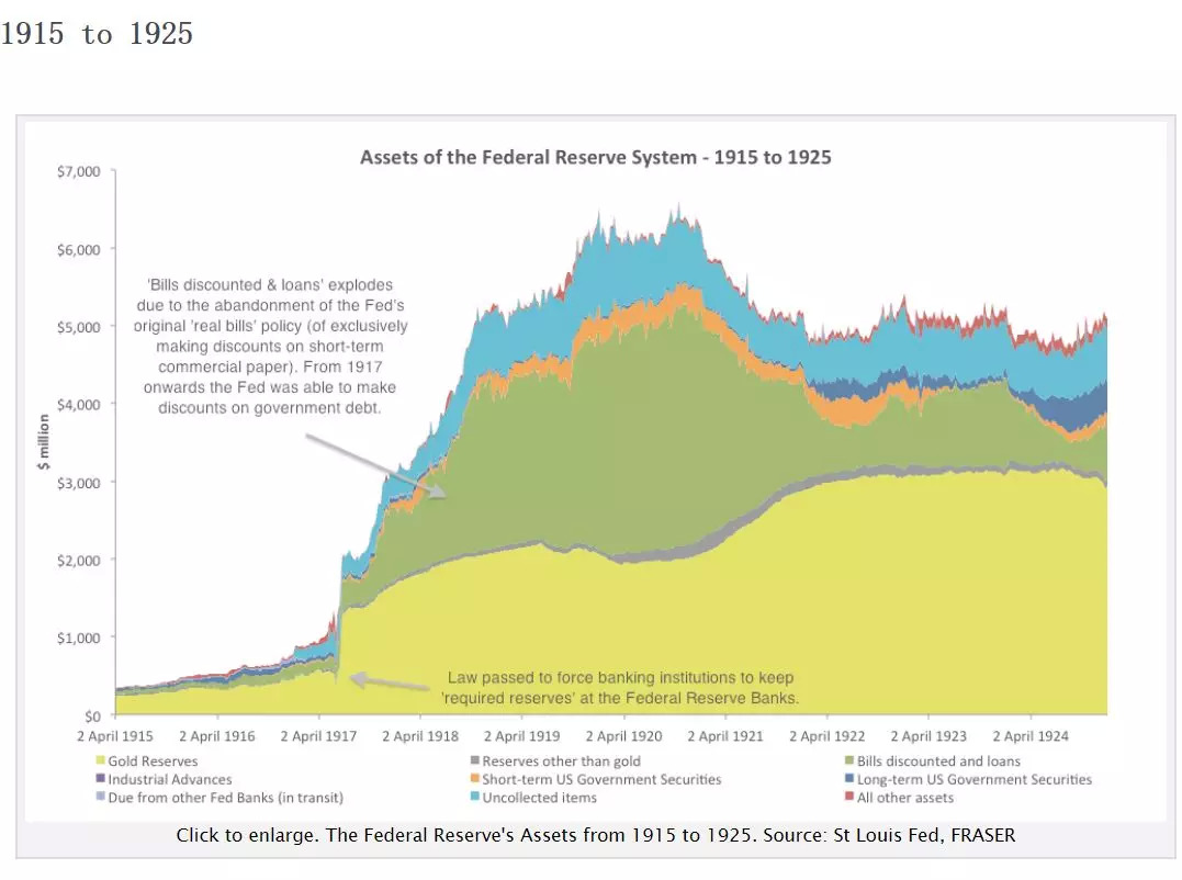 20世纪初,国际货币体系仍在金本位的统治下。各大央行的资产端仍以黄金储备为主,美联储亦不例外。