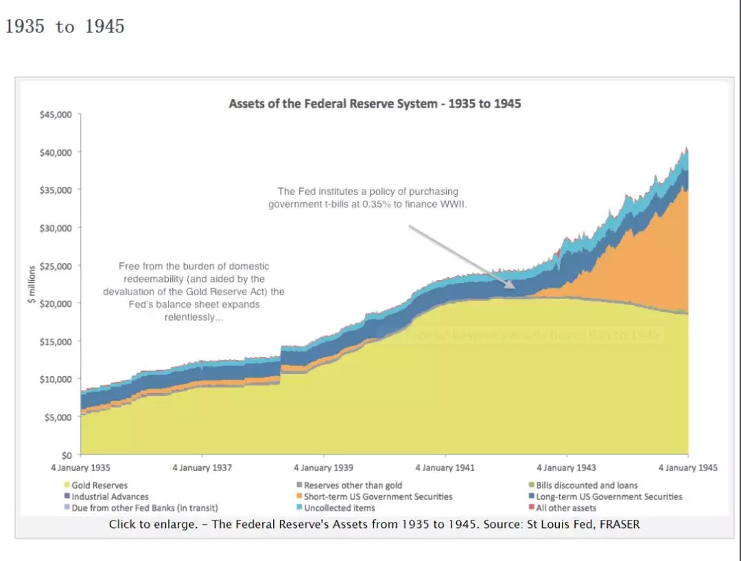 其中有意思的是,我们可以看到,1941年12月7号日本偷袭珍珠港之后,美国对日、德宣战并加入第二次世界大战。此后美联储资产端的短期公债规模也相应地爆炸性般飞速提高——这亦是公债作为战争融资工具的又一个生动例子。