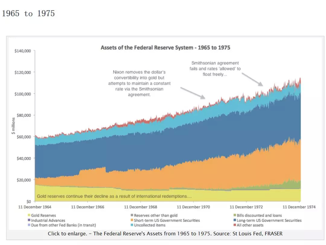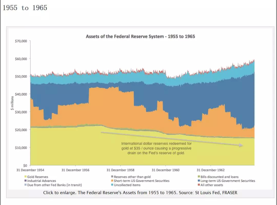 首先,从1955-1965的十年变迁来看,随着类金本位的布雷顿森林体系确立,与黄金定额挂钩的美元成为了世界货币,由于该体系下各国央行对黄金储备时不时的兑付要求,联储的黄金储备自此开始缓慢下降。